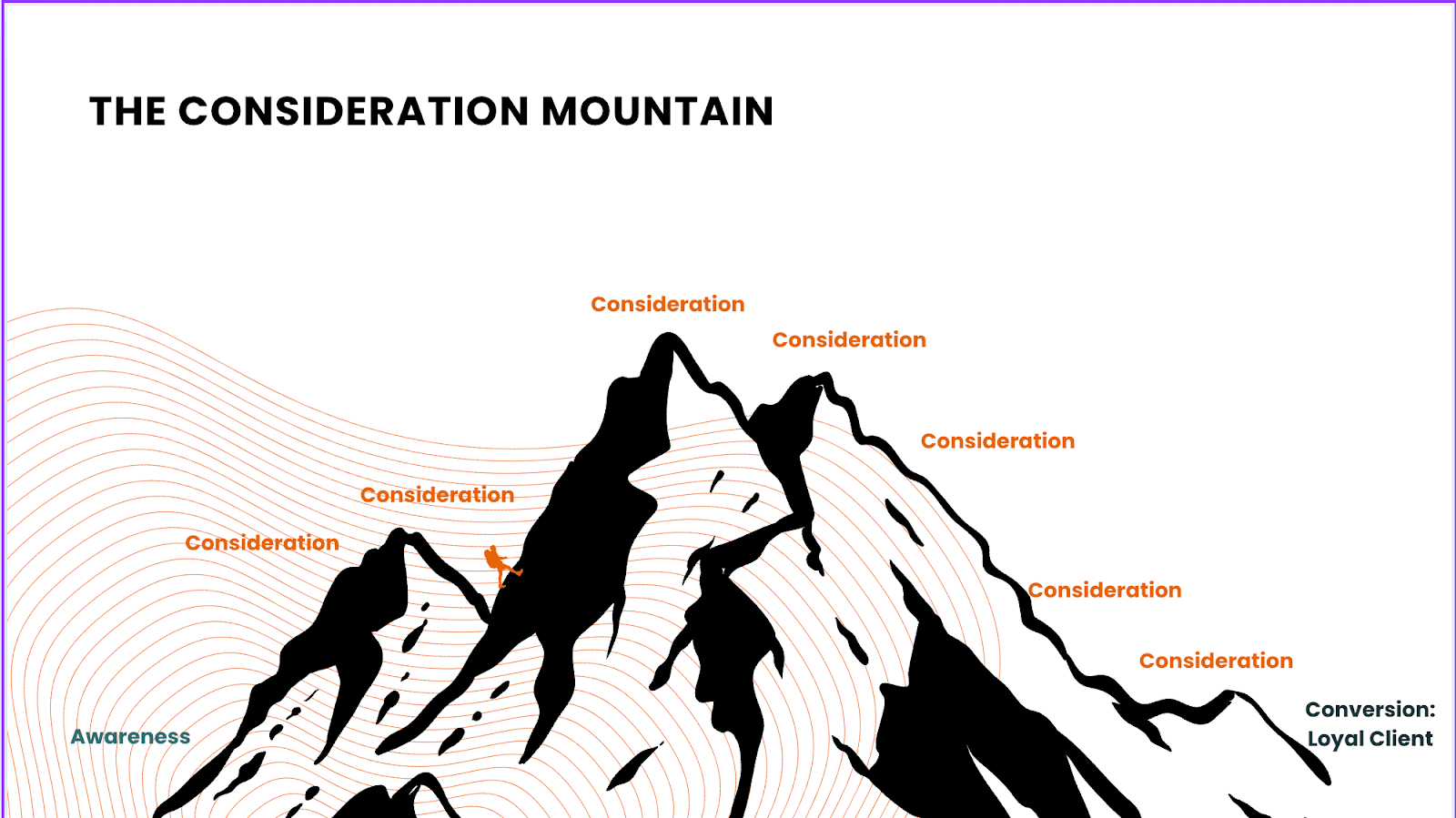 If "Awareness" is the spark, Consideration Mountain is the long, arduous climb. This phase represents the peaks and troughs between a customer first noticing you and finally making a decision. In 2026, this journey is not linear because buyers are more risk-averse than ever.